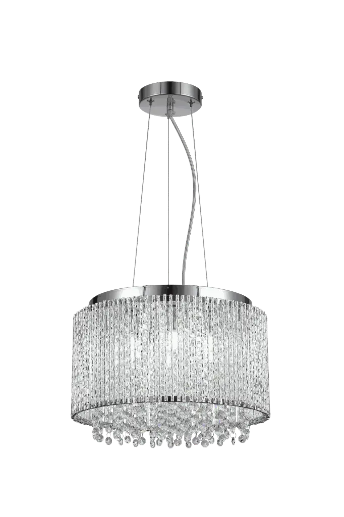 The Anak 6-light pendant is a stunning chandelier featuring a polished chrome finish and a drum-shaped shade adorned with cascading crystal beads. The cylindrical frame is intricately detailed with multiple strands of reflective crystals, creating a dazzling display when illuminated. A cluster of six lamp holders within the crystal-encased drum casts a radiant glow, enhanced by the reflective quality of the crystals.