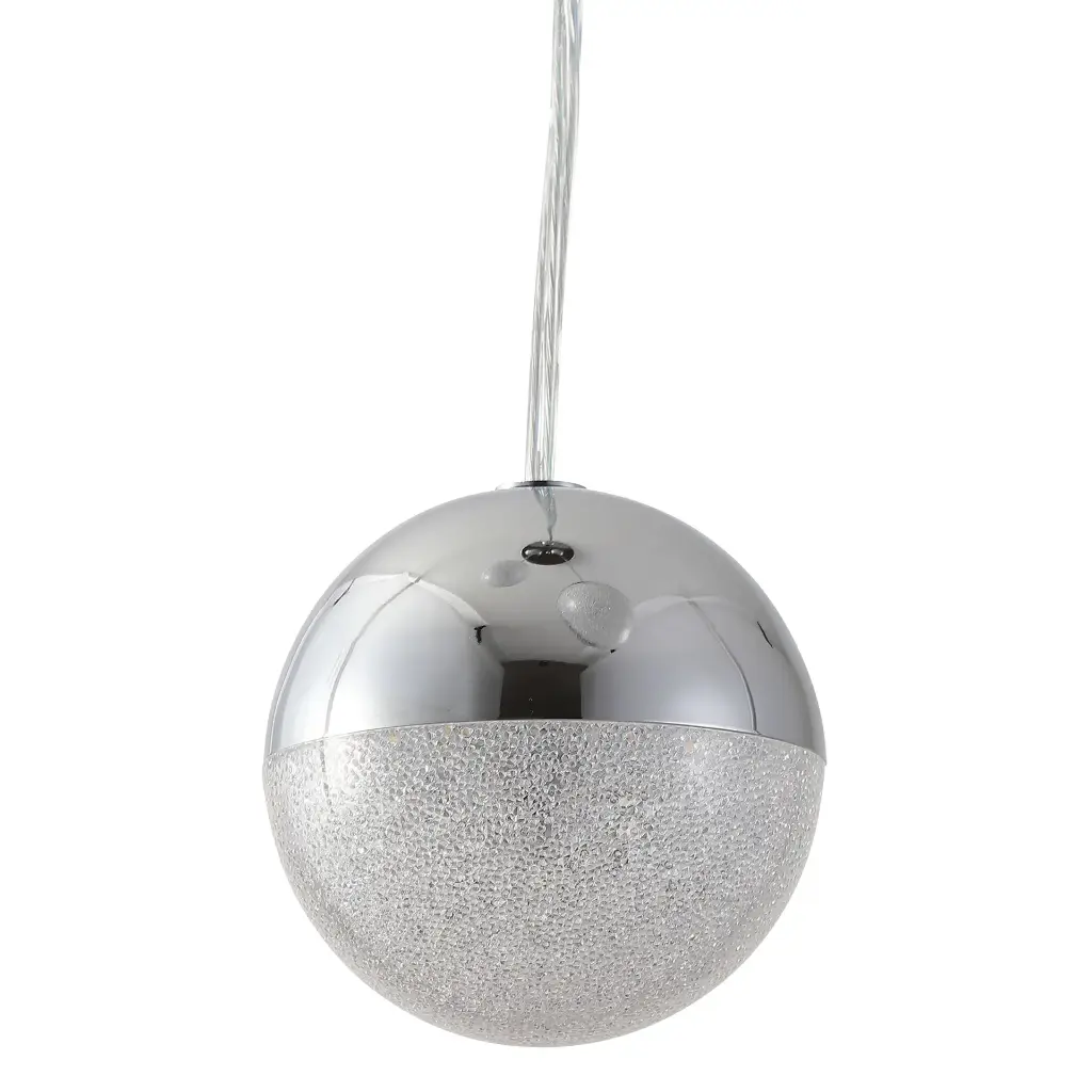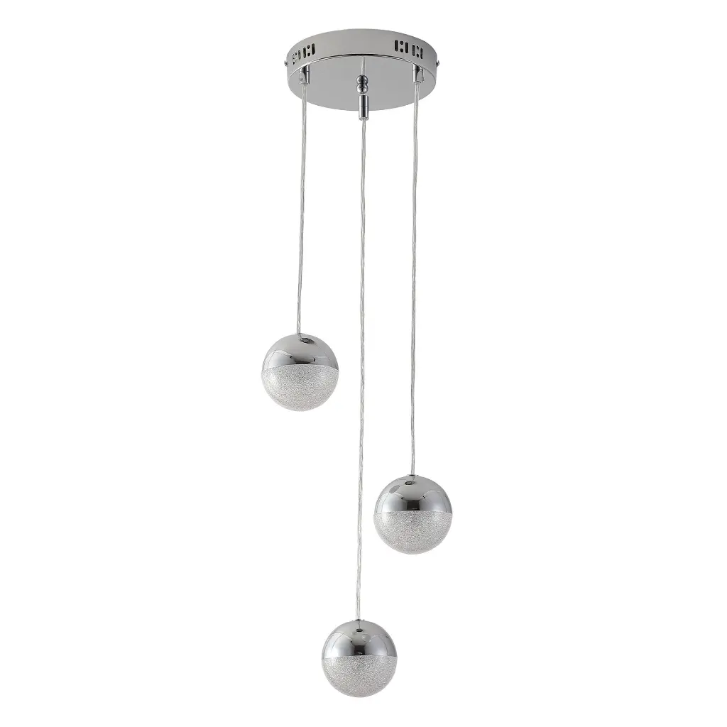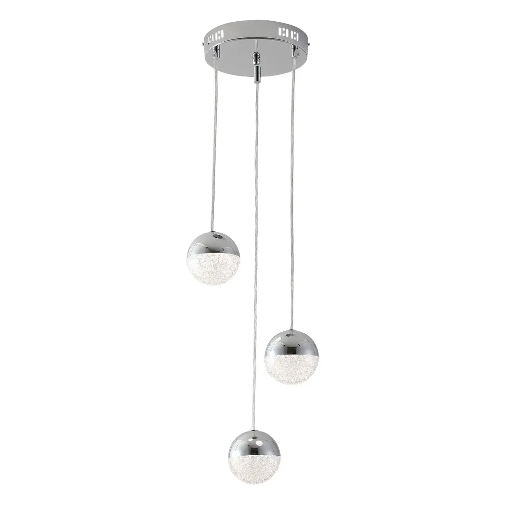 Elevate your interior with the modern elegance of the Eun 3 pendant, a stunning lighting fixture featuring cascading glass spheres in a harmonious arrangement. Featuring three perfectly polished chrome spheres suspended at varying heights, this design creates a striking yet understated focal point for any space.