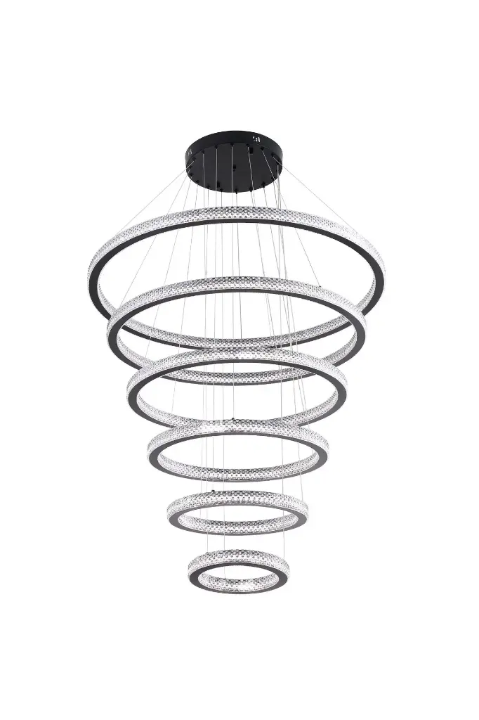 Elevate your space with this stunning multi-ring LED chandelier, a perfect blend of modern elegance and functional lighting. Featuring a cascading design with six glowing circular rings suspended at varying heights, this fixture creates a mesmerizing visual effect. Each ring is crafted with intricate patterns that enhance the diffusion of light, adding a soft and luxurious ambiance to any room.