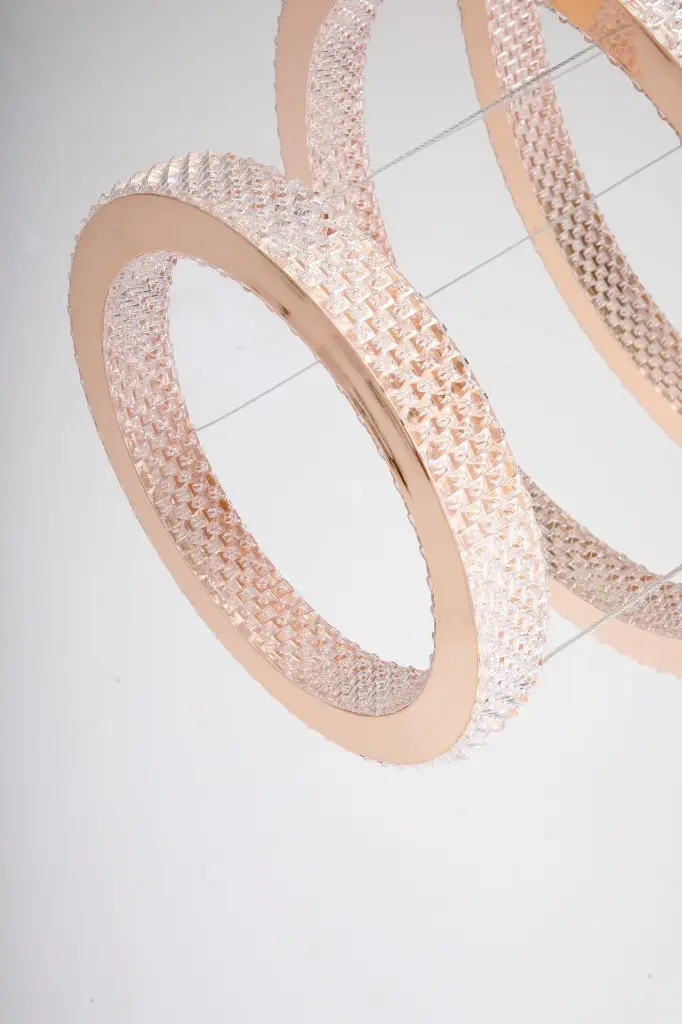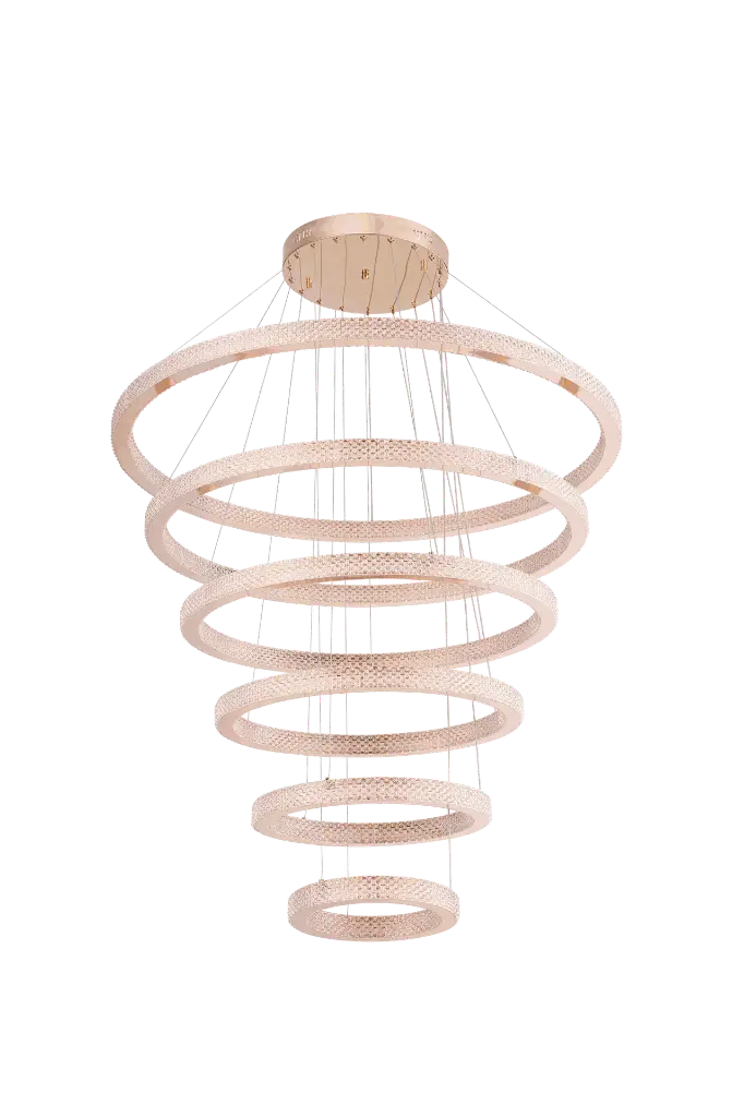 Elevate your space with this stunning multi-ring LED chandelier, a perfect blend of modern elegance and functional lighting. Featuring a cascading design with six glowing circular rings suspended at varying heights, this fixture creates a mesmerizing visual effect. Each ring is crafted with intricate patterns that enhance the diffusion of light, adding a soft and luxurious ambiance to any room.
