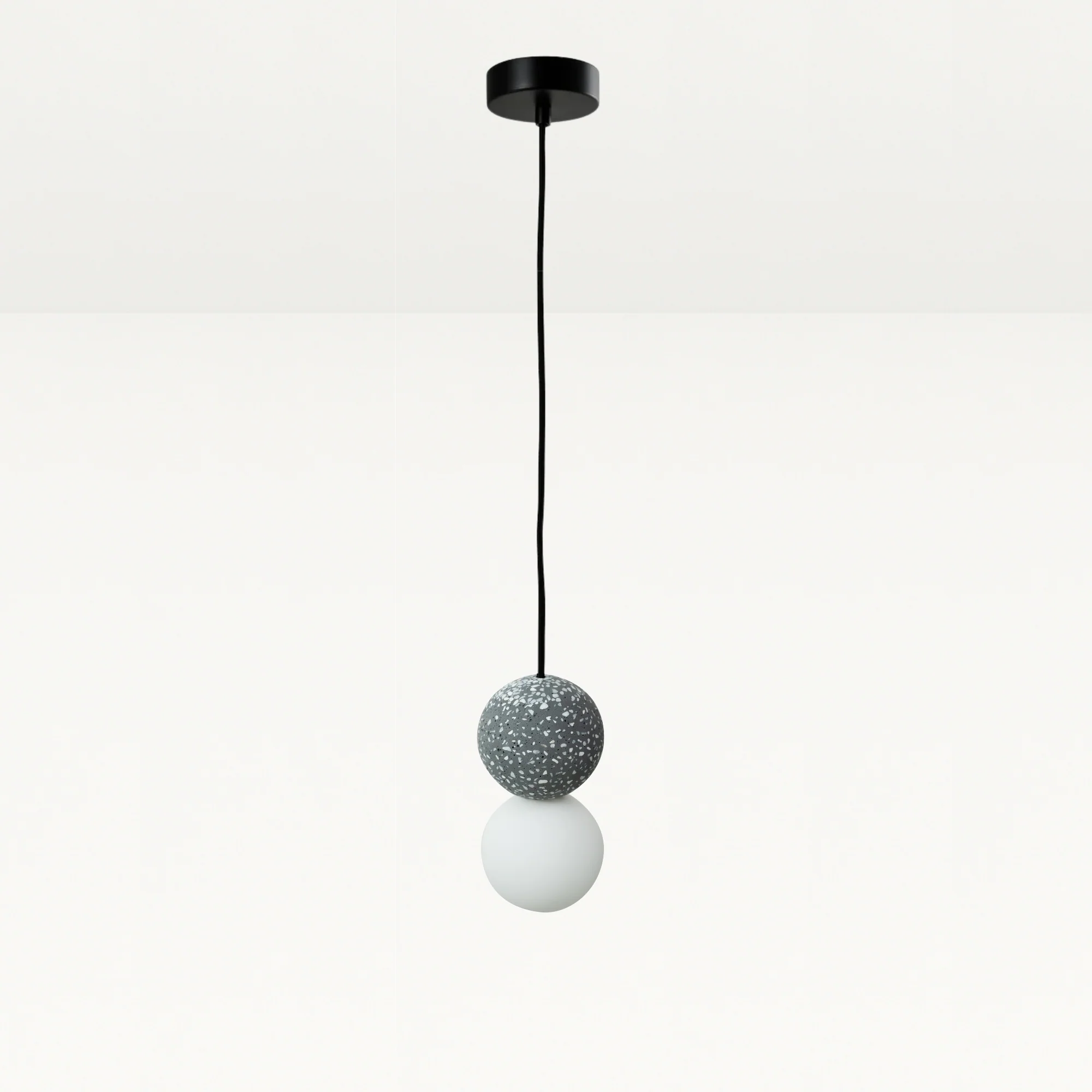 Crafted in black terrazzo, the pendant features a dark mid-grey base with scattered black and white stone flecks. The subtle contrast adds texture and depth while maintaining a calm, neutral presence.