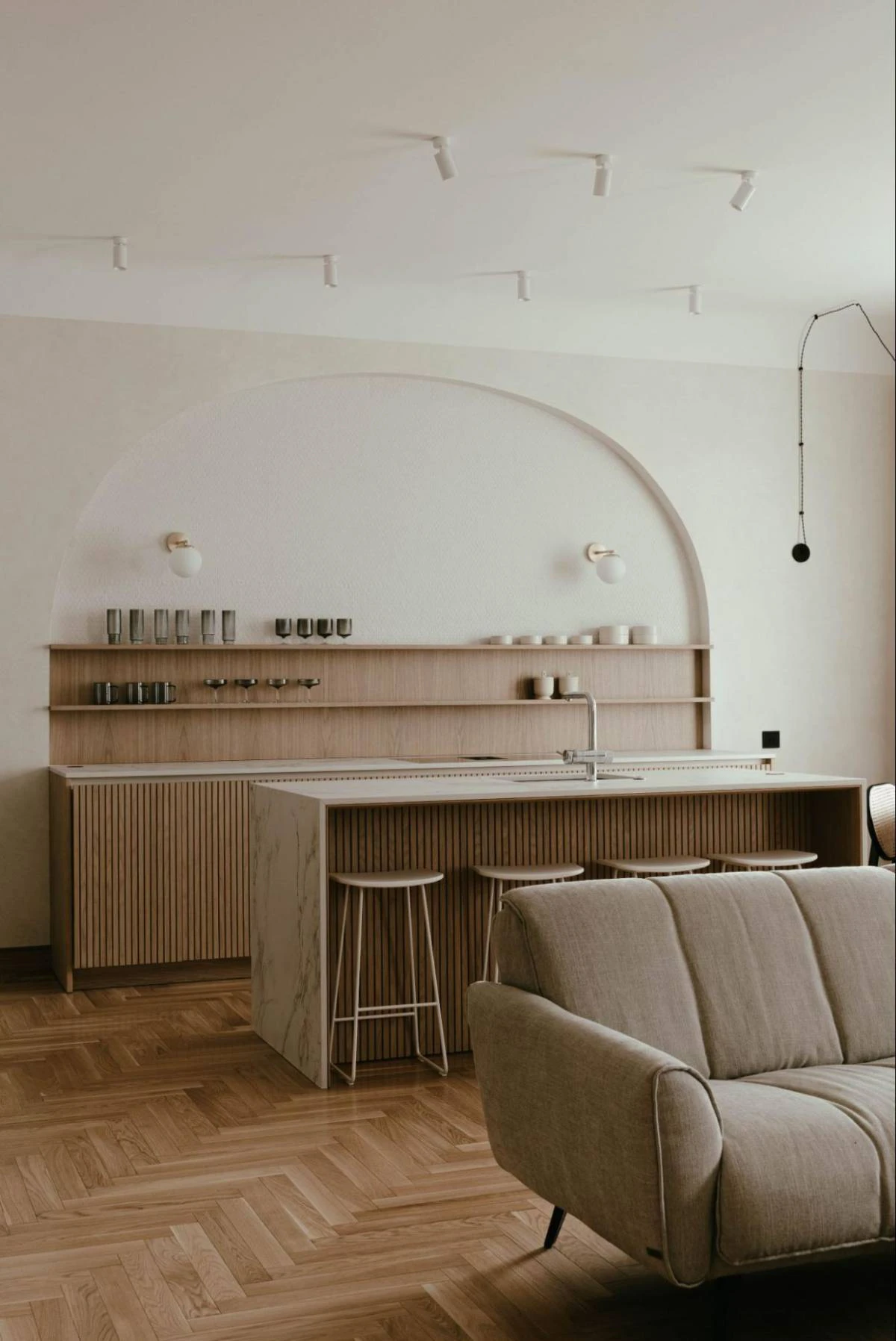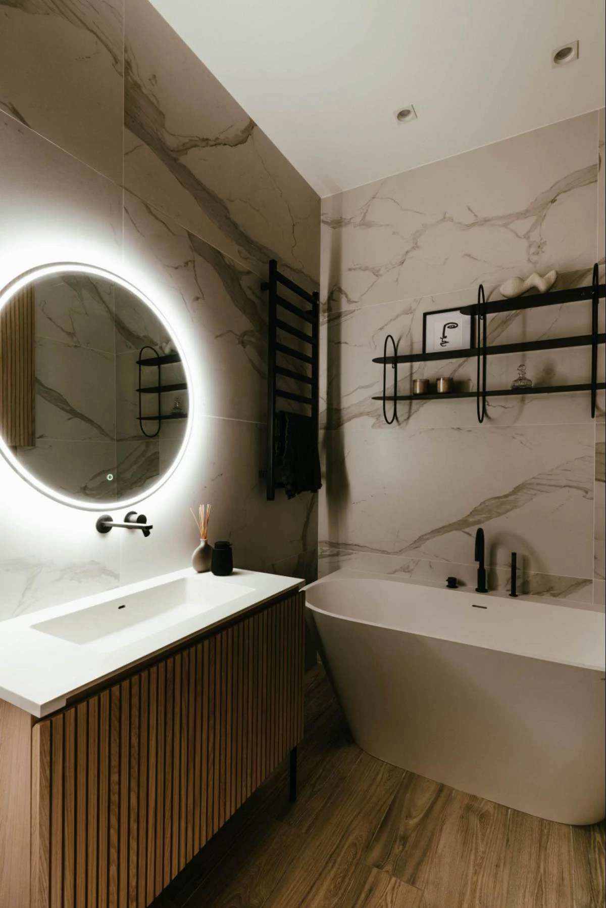 Decorative lighting harmoniously blends with technical lighting, creating a warm ambience within the interior. This illumination seamlessly merges with the overall colour scheme and lines.