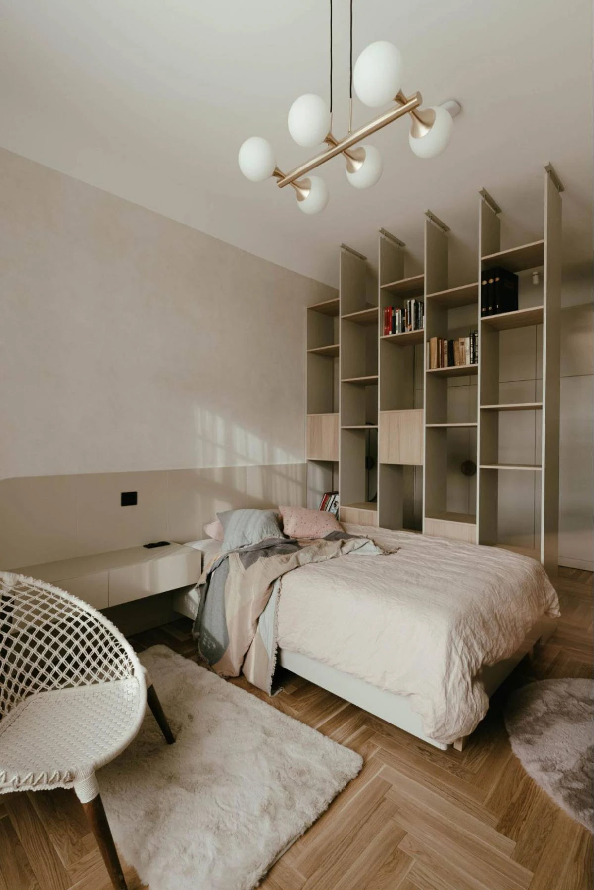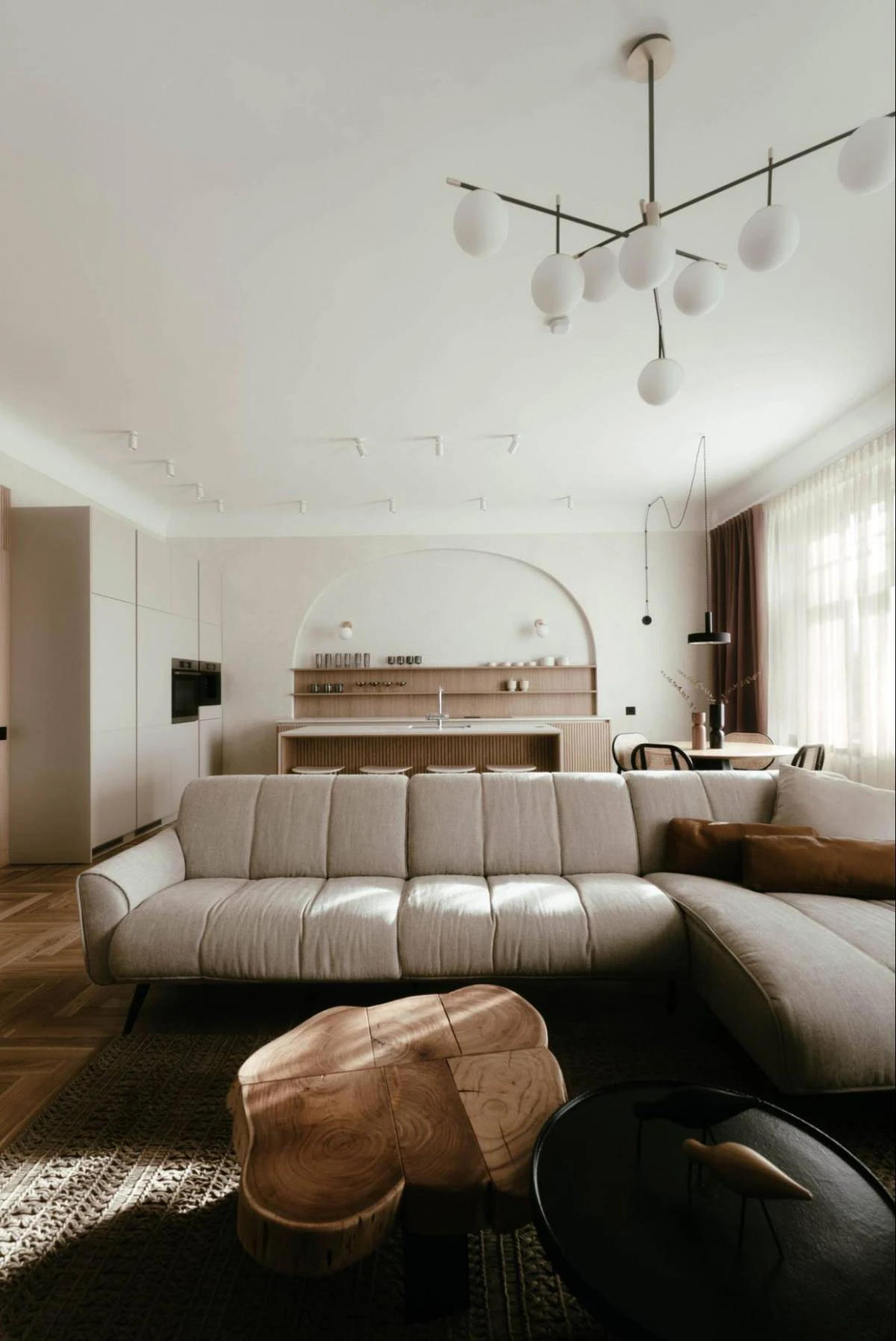 The tastefully curated interior design is enhanced by functional lighting with decorative elements. The trendy white glass spheres, popular in recent years, elegantly complement the kitchen area, lounge room, and even the children's room.
