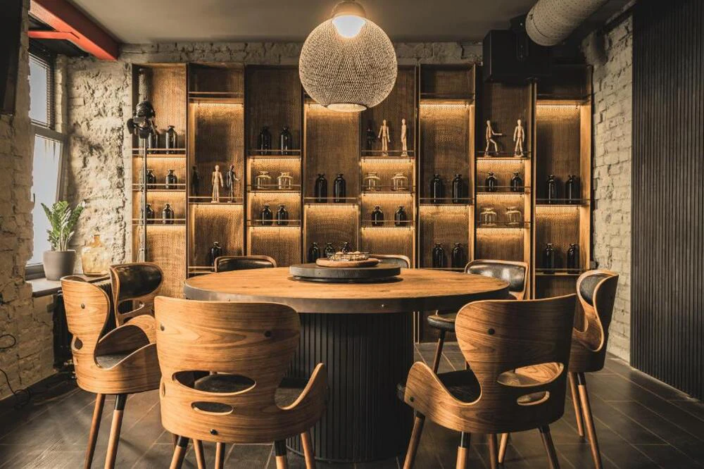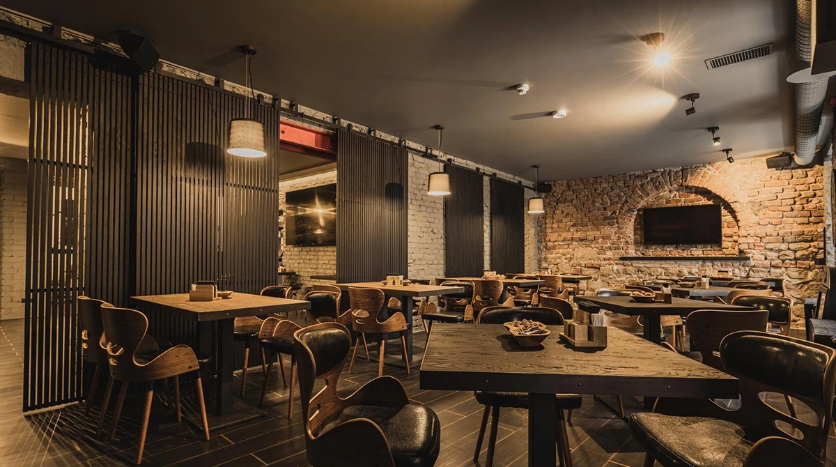 The modern interior captivates from the very first glance. The stylistic features of the space include distinctive elements of industrial design, enhanced by spotlight fixtures. The restaurant's warmth is preserved through ample use of wood in the interior, patterned tiles, a vibrant bar counter, and soft-upholstered lounges.